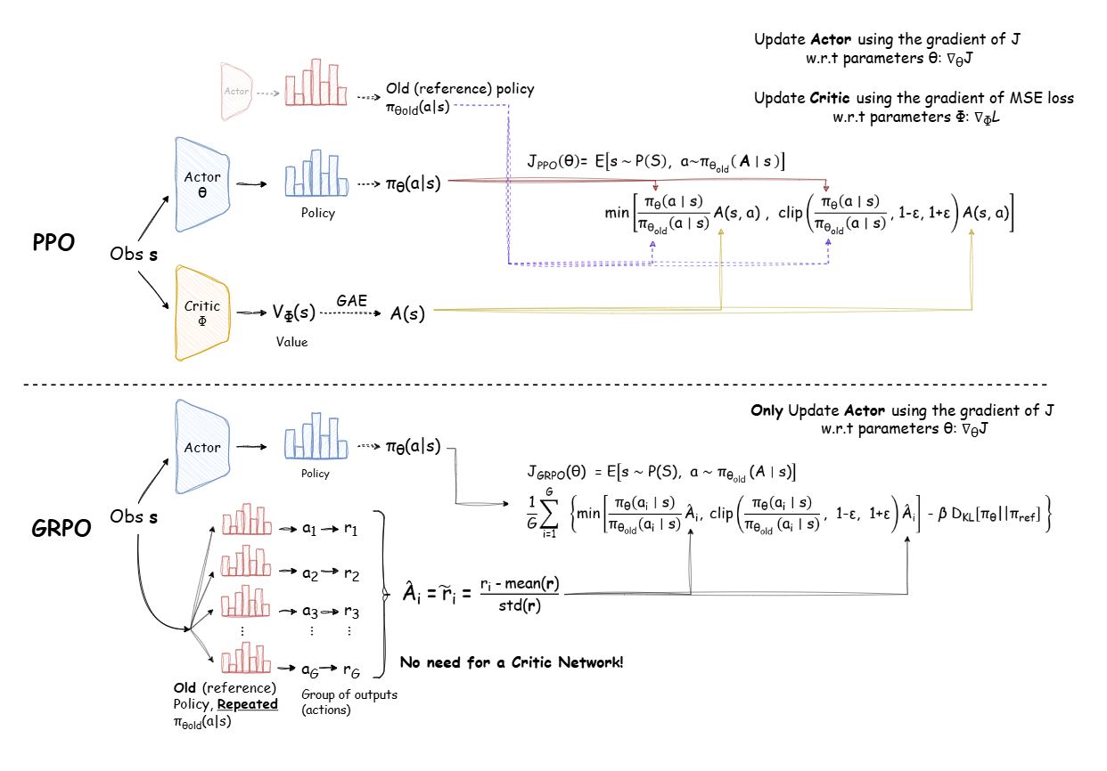 - Instead of standard PPO, which optimizes with a single policy and reward, GRPO divides outputs into groups and evaluates relative advantages among them.